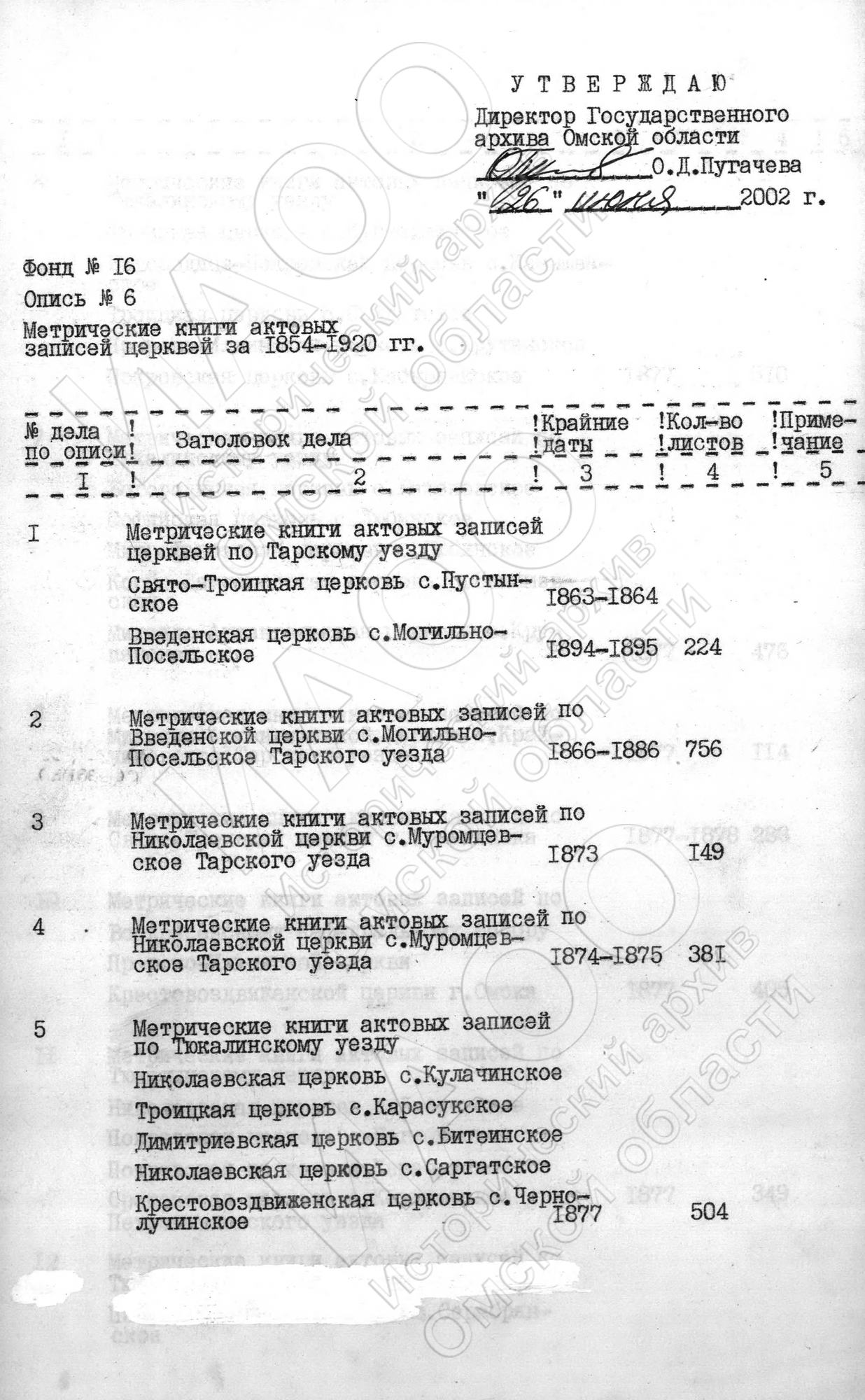 В описи имеются брачные обыски свято-Троицкой церкви с. Пустынского Тарского уезда и Михаило-Архангельской церкви с. Ядринцевского Тюкалинского уезда Имеются актовые записи иных конфессий: Рождественской старообрядческой общины с. Седельниковского Тарского уезда и Карбаиновской старообрядческой общины с. Карбаиновского Тюкалинского уезда. Так же в описи имеются метрические книги актовых записей Свято-Троицкой церкви с. Леузы Уфимской епархии.Показаны записи 1-20 из 1 503.